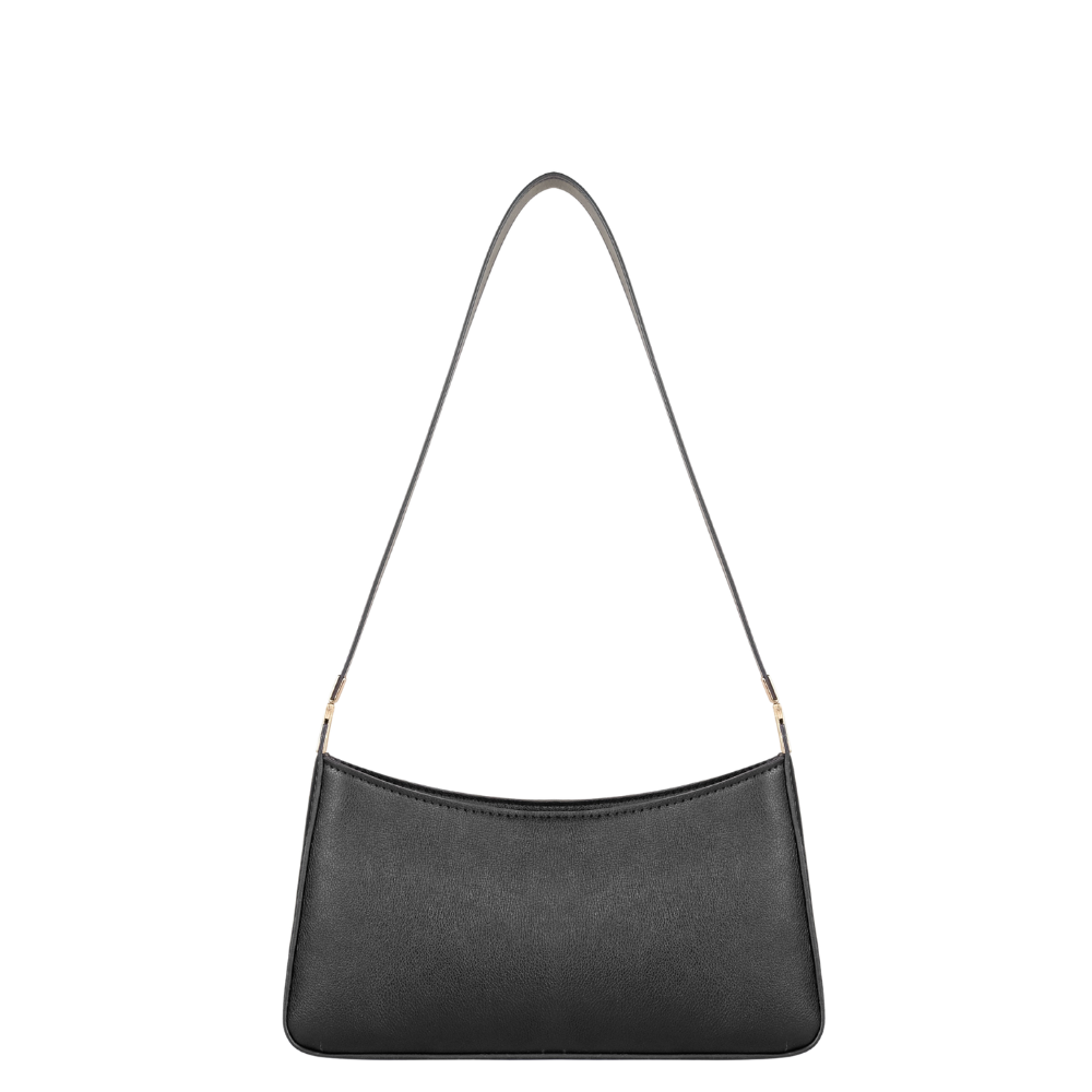 This black shoulder bag features a sleek, curved silhouette that provides a modern and clean aesthetic. The solid dark finish makes it a versatile accessory that can be effortlessly paired with various outfits for both formal and casual settings. Its structured frame ensures the bag maintains its polished shape while remaining lightweight for comfortable daily use.